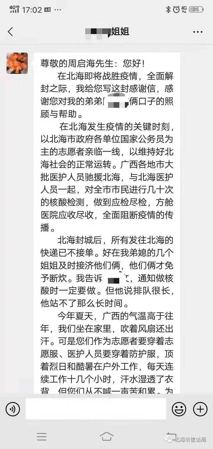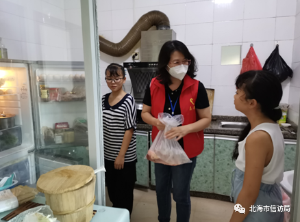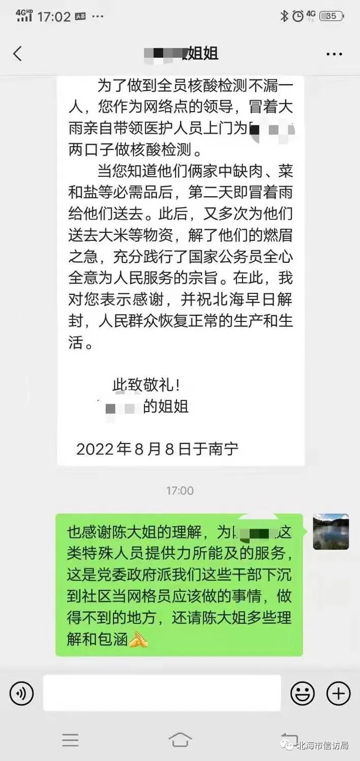 来信人的弟弟与弟媳是第七网格邮政宿舍的住户,二人患有不同程度的心理疾病,对亲属以外的人十分抗拒。第七网格的工作人员在开展“敲门行动”期间,从附近居民处了解到该户情况后,反复多次敲门劝导,并积极通过社区与其亲属取得联系,耐心劝导,根据实际情况,最终成功为住户安排了核酸检测。在了解到其亲属远在南宁,家中生活物资短缺后,网格工作人员多次为其送去大米、蔬菜等物资。网格工作人员还时常细心安抚住户情绪,为其解释当前防控政策要求,劝解住户配合核酸,遵守相关要求,缓解住户的焦虑。