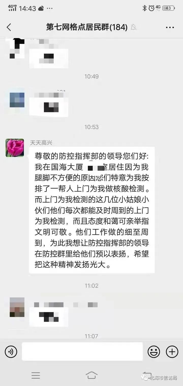 “因为我腿脚不方便的原因,您们特意为我按排了一帮人上门为我做核酸检测,而上门为我检测的这几位小姑娘小伙们他们每次都能及时周到的上门为我检测,而且态度和蔼可亲,举止文明可敬。”