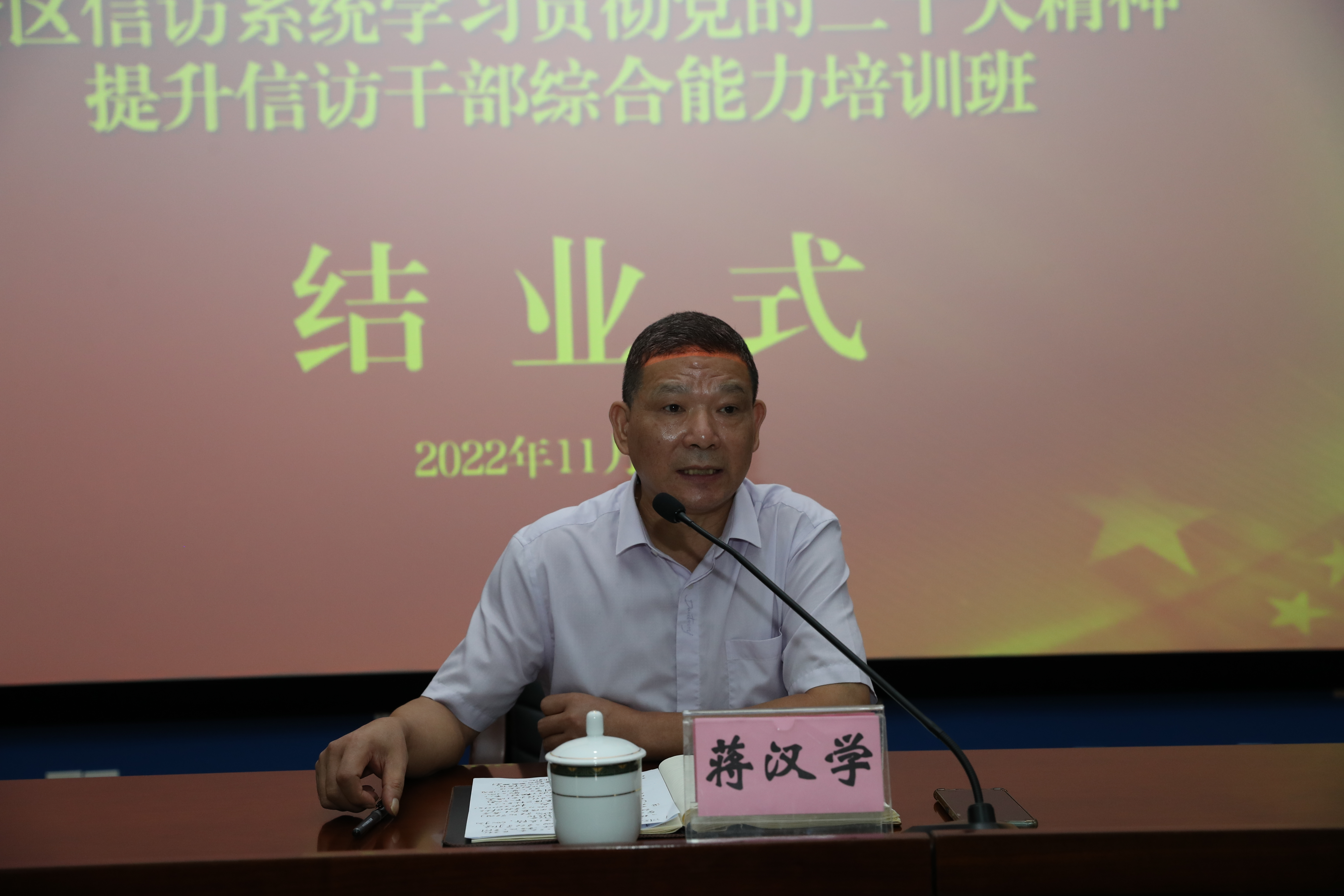 自治区365Bet体育_365正规网站是多少_365bet体育滚球局副局长蒋汉学对培训班进行了小结,强调指出,365Bet体育_365正规网站是多少_365bet体育滚球部门要学深悟透党的二十大精神,积极融入到建设社会主义现代化国家新征程上来;要深入贯彻落实习近平总书记关于加强和改进人民365Bet体育_365正规网站是多少_365bet体育滚球工作的重要思想和《365Bet体育_365正规网站是多少_365bet体育滚球工作条例》,积极推动我区365Bet体育_365正规网站是多少_365bet体育滚球工作高质量发展。要紧盯工作重点,解决工作中存在的短板弱项,在事要解决上下功夫,切实解决老百姓急难愁盼的问题;在能力提升上下功夫,锻造一支召之即来、来之能战、战之能胜的365Bet体育_365正规网站是多少_365bet体育滚球干部队伍;在业务规范上下功夫,让365Bet体育_365正规网站是多少_365bet体育滚球群众时时刻刻感觉到公平和正义,合理诉求及时得到依法解决;在机制健全上下功夫,要建立一批既立足于当前,又管长远的365Bet体育_365正规网站是多少_365bet体育滚球工作机制,确保365Bet体育_365正规网站是多少_365bet体育滚球工作行稳致远,为建设新时代壮美广西做出积极贡献。