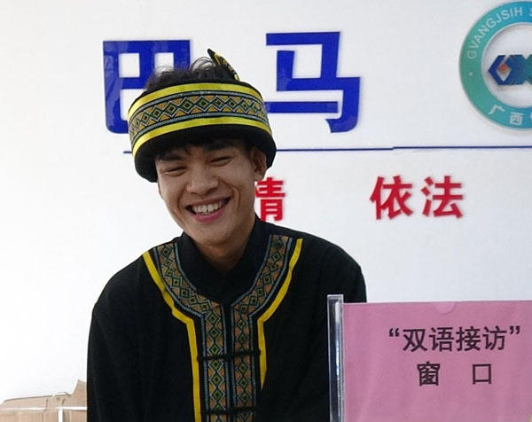 巴马瑶族自治县365Bet体育_365正规网站是多少_365bet体育滚球局群众接访服务大厅瑶族干部李大利,自2020年11月参加工作以来,就在“双语接访”窗口服务少数民族来访群众。对待来访的少数民族群众,他总是面带笑容用当地语言与之交流沟通,倾听他们的诉求,并做到有求必应,对维护少数民族地区的和谐稳定起到积极作用。